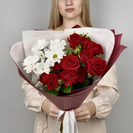Современная упаковка - 1 шт., Лента атласная - 1 шт., Хризантема кустовая - 1 шт., Роза кустовая пионовидная - 2 шт., Роза Ред Наоми (50см) РОССИЯ - 3 шт.Доставка 0₽ от 30-ти минут